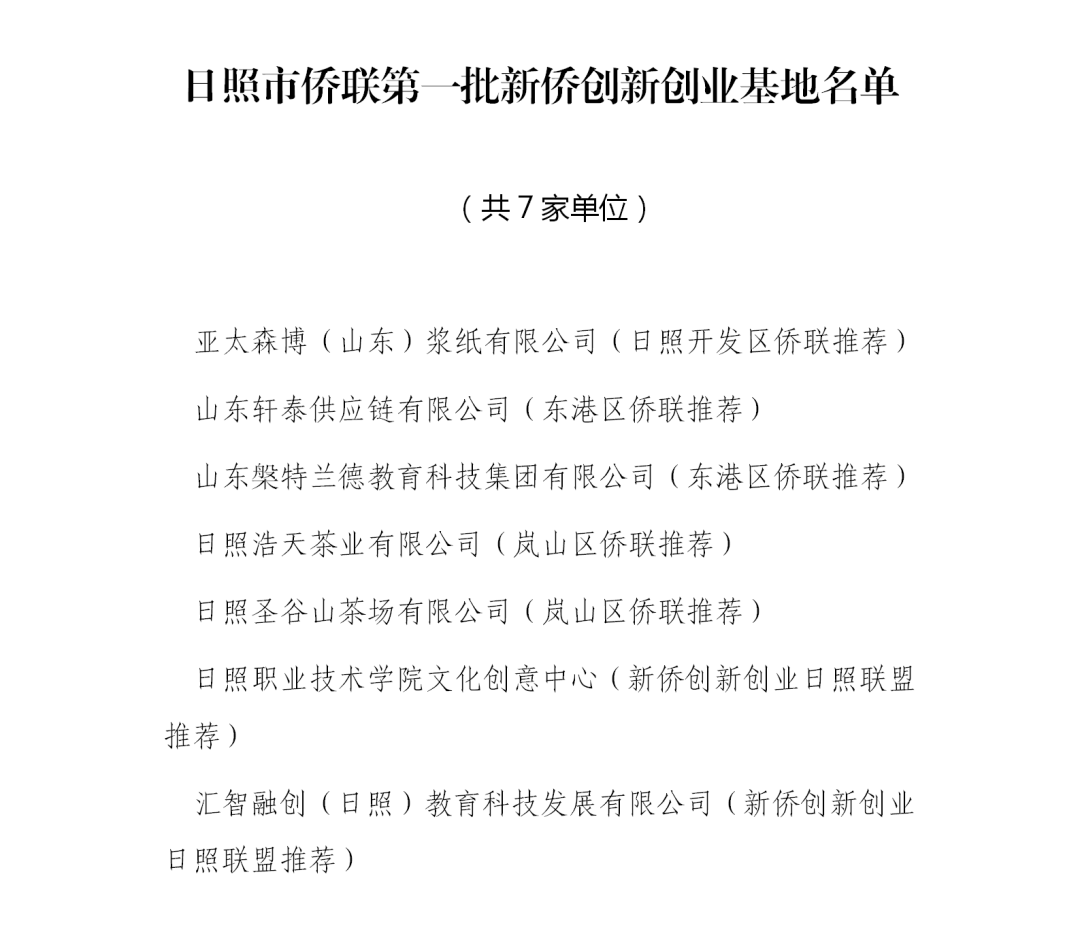 第一批“日照市侨联新侨创新创业基地”名单公布